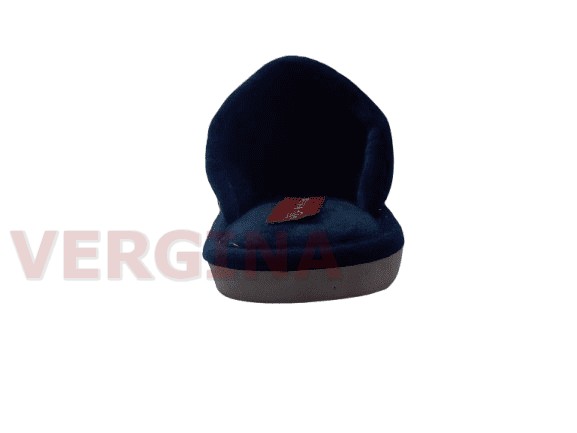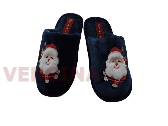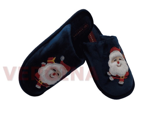 Γυναικεία παντόφλα βελουτέ σε χρώμα μπλέ με τον Αγ.Βασίλη το ύψος του πέλματος μπροστά είναι 1 εκατοστό και πίσω 1,2 εκατοστά.Το βελούδινο ανεξίτηλο ύφασμα κρατά τα πόδια σας ζεστά( δεν μυρίζει δεν ξεβάφει από την χρήση), έχει εύκαμπτη και αντιολισθητική σόλα και ραφτή ,εξαιρετικής κατασκευής.