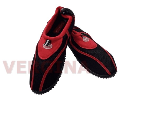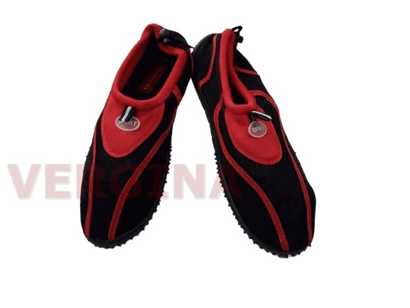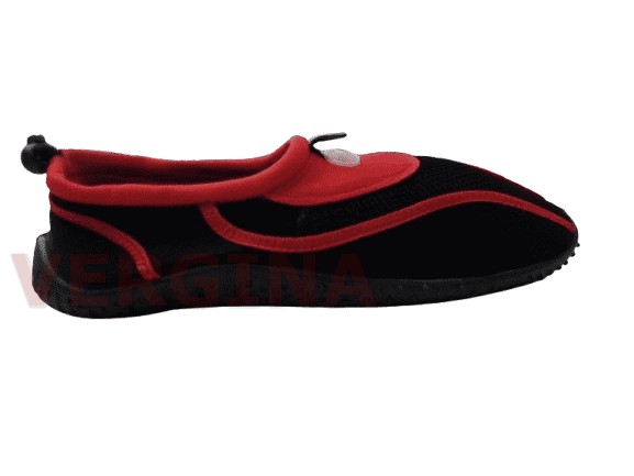 Ανδρική παντόφλα ελαστικό ύφασμα παπουτσάκι θαλάσσης σε χρώμα μαύρο-κόκκινο το ύψος του πέλματος μπροστά είναι 1 εκατοστό και πίσω 1,5 εκατοστά.Η σόλα είναι λάστιχο με ανάγλυφη για καλύτερη σταθερότητα, είναι πολύ εύκαμπτο.Το ελαστικό ύφασμα δινει την αίσθηση της κάλτσας που εφαρμόζει τέλεια στο πόδι.Το καρδόνι σφίγγει στον αστράγαλο για καλύτερη σταθερότητα. Έχει τρίπες το ύφασμα για να αερίζεται το πόδι. Ιδανικό για μέσα στη θάλασσα και κολύμπι.