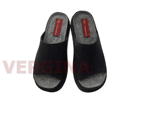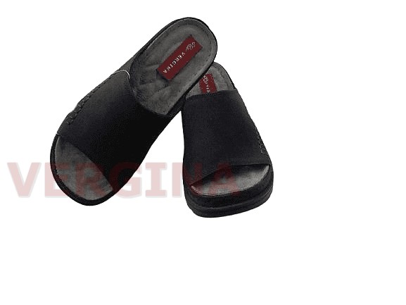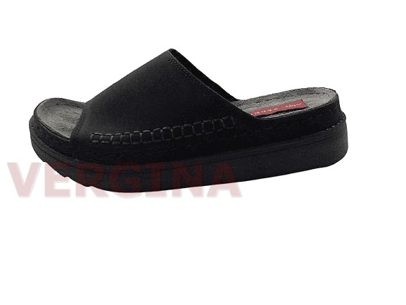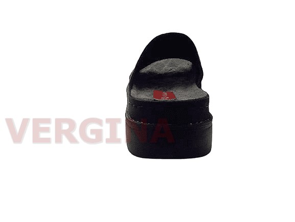 Γυναικεία παντόφλα δέρμα σε χρώμα μαύρο το ύψος του πέλματος μπροστά είναι 3,4 εκατοστά και πίσω 4,7 εκατοστά.Ο ανάγλυφος πάτος είναι ανατομικός ,μαλακός ,δερμάτινος και διαμορφωμένος με τέτοιο τρόπο ώστε να προσδίξει στο πόδι την ορθή κλίση και τις κατάλληλες καμπύλες.Παράλληλα,διαθέτει ανατομικό πέλμα και αφρώδη υλικό κι ειδικό το οποίο προσφέρει στο υπόδημα τη δυνατότητα να ξεκουράζει το πόδι, καθιστώντας τη χρήση του πιο άνετη κι αναπαυτική. Η σόλα είναι πολυουρεθάνη ελαφριά δεν γλιστράει στο περπάτημα ενώ παράλληλα παρέχει αντιολισθητική προστασία προσφέροντας ένα ασφαλές και σταθερό περπάτημα.