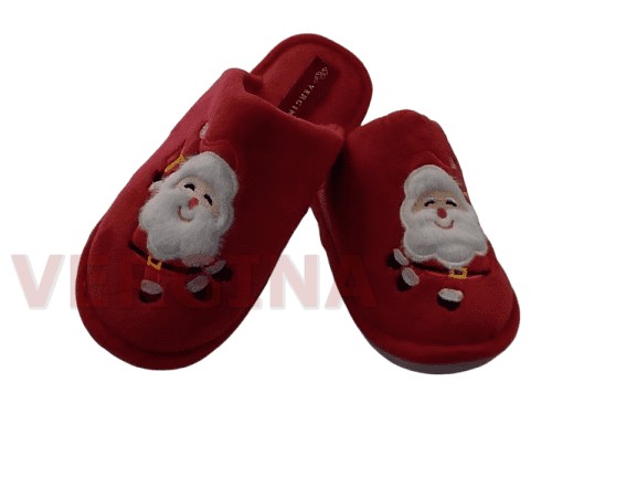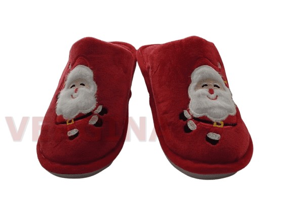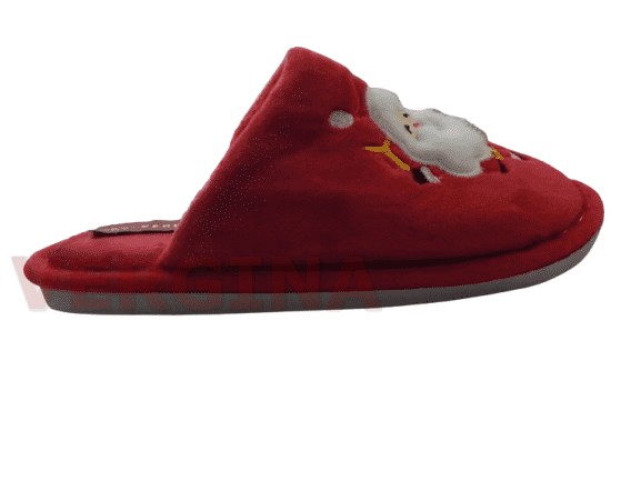 Γυναικεία παντόφλα βελουτέ σε χρώμα κόκκινο με τον Αγ.Βασίλη το ύψος του πέλματος μπροστά είναι 1 εκατοστό και πίσω 1,2 εκατοστά.Το βελούδινο ανεξίτηλο ύφασμα κρατά τα πόδια σας ζεστά( δεν μυρίζει δεν ξεβάφει από την χρήση), έχει εύκαμπτη και αντιολισθητική σόλα και ραφτή ,εξαιρετικής κατασκευής.
