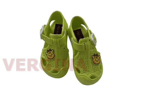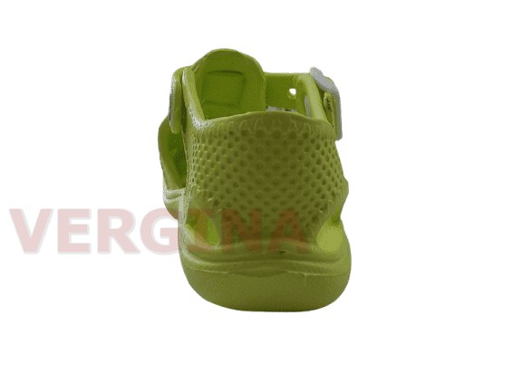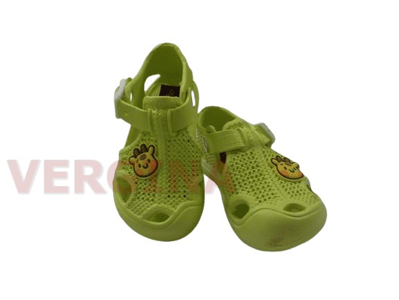 Παιδική παντόφλα πλαστική σε χρώμα λαχανί το ύψος μπροστά είναι 1 εκατοστό και πίσω 1,5 εκατοστό.Έχει άνετη φόρμα ,ιδανική για χρήση νερού έχει λουράκι με κούμπωμα που κρατάει τη φτέρνα για καλύτερο κράτημα.Δεν γλιστράει και για καθημερινή χρήση.